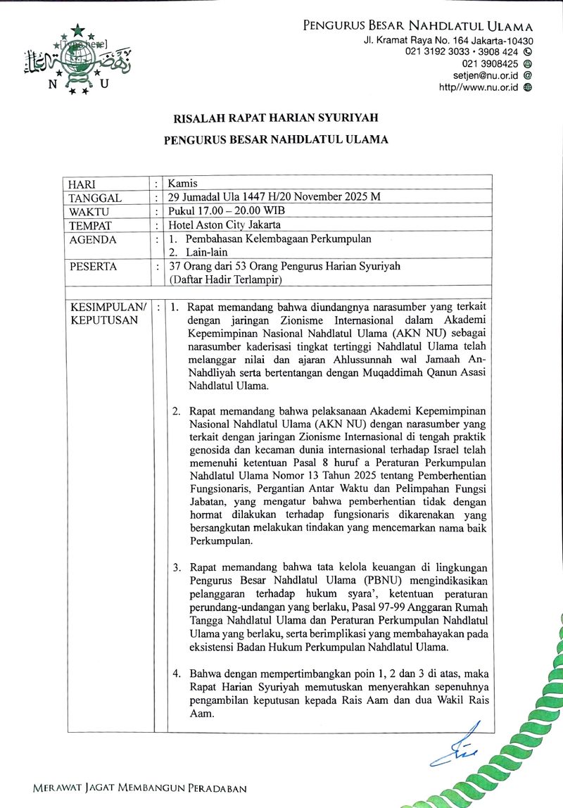 Rapat Harian Syuriyah PBNU menyampaikan bahwa penyelenggaraan Akademi Kepemimpinan Nasional Nahdlatul Ulama (AKN NU) yang menghadirkan seorang narasumber yang disebut memiliki keterkaitan dengan jaringan Zionisme Internasional telah bertentangan dengan nilai dan ajaran Ahlussunnah wal Jamaah An-Nahdliyah. Tindakan itu juga dinilai melanggar Muqaddimah Qanun Asasi Nahdlatul Ulama, yang menjadi dasar etika dan prinsip kaderisasi di lingkungan Nahdlatul Ulama.